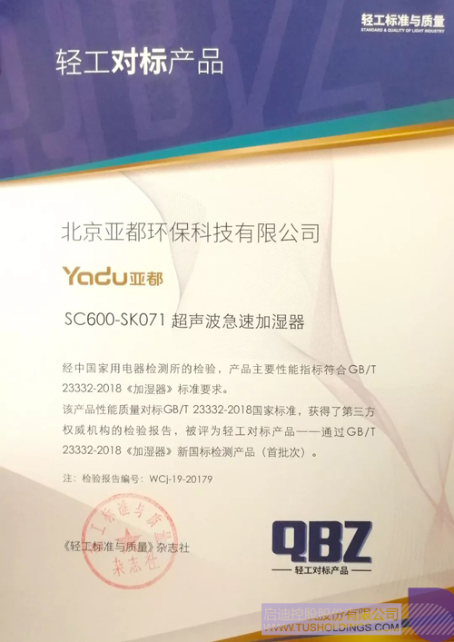 在发布会的颁奖环节,北京亚都环保科技有限公司SC600-SK071型超声波急速加湿器主要性能指标经中国家用电器检测所检测,符合GB/T 23332-2018《加湿器》标准要求,获得了第三方权威机构的检验报告,被评为首批通过GB/T 23332-2018《加湿器》新国标检测的轻工对标产品。