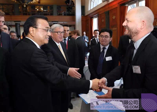 ▲瑞典浣贝尔自动化公司总裁Magnus Stjernberg(右一)受到李克强总理和容克主席的亲切接见