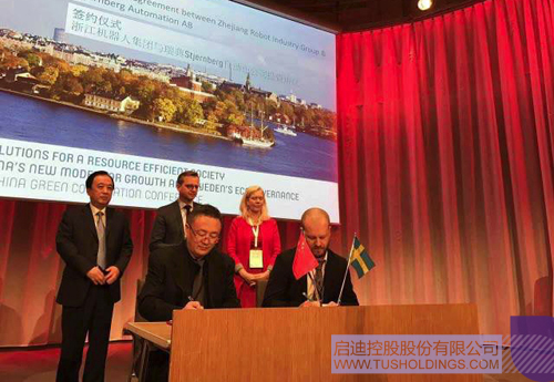 金服总经理、浙江机器人产业集团总经理朱春荣与瑞典浣贝尔公司代表签约