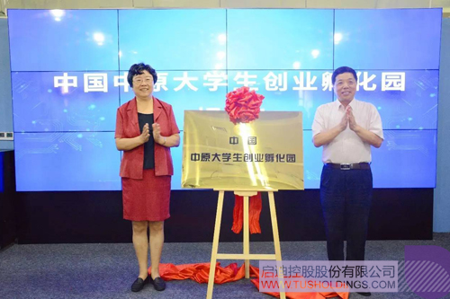 河南省人民政府副秘书长王梦飞(右)与清华大学校务委员会副主任韩景阳为中国中原大学生创业孵化园揭牌
