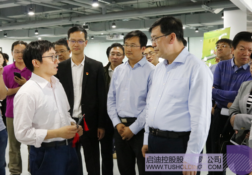 邱虹云博士(前排左一)向阴和俊副市长(右一)介绍光速视觉
