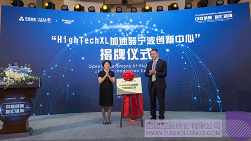 镇海区委书记林雅莲(左)和荷兰王国驻上海总领事馆创新、科技与科学处官员Bart VanHezewijk共同为“HighTechXL加速器宁波创新中心”揭牌
