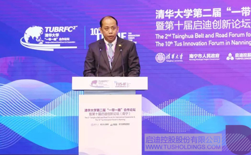 控股董事长王济武出席开幕式并致辞。中联部原副部长、中国人民争取和平与裁军协会副会长于洪君,缅甸联邦共和国驻华大使馆公使Mr.Han Win Aung,广西壮族自治区科技厅厅长曹坤华,中国—东盟商务理事会执行理事长许宁宁做主旨发言。论坛开幕式由清华大学一带一路战略研究院执行院长史志钦主持。