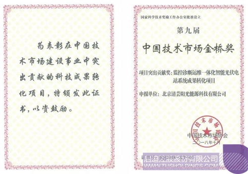 清芸 “监控诊断运维一体化智能光伏电站系统”(SOLARULE系统)斩获中国技术市场金桥奖项目突出贡献奖,并在同类奖项中名列第一。