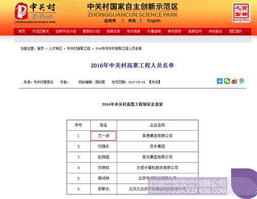 乐鱼app官网登录入口-乐鱼(中国) 桑德董事长文一波入选“2016年中关村高聚工程领军企业家”打印