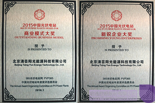 2015年,荣获“中国光伏电站新锐企业大奖”、“中国光伏电站商业模式大奖”。