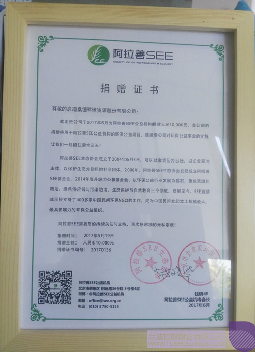 桑德于2015年9月加入SEE(阿拉善),正式成为阿拉善生态协会一员,借此平台全面参与环境保护工作,完善企业社会责任体系建设。旗下桑顿新能源秉承“为环境,无止境”的理念,践行绿色环保,于2016年9月5日认养青钱柳古树,成为该认养计划的首批爱心企业。